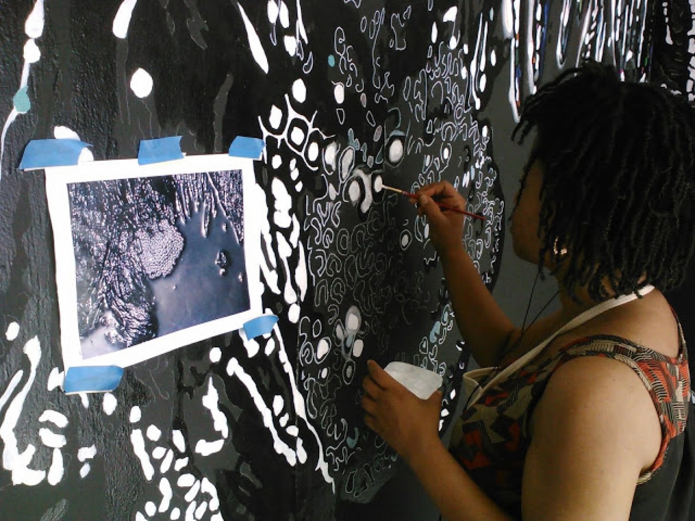 I played with a small series of photographs that included this image, which implied aspects of containment, the 'edges' of an occurrence. As I flipped the images to produce a mirroring effect, mythological faces appeared - witnesses to the eons of ‘presence’ at this site. The process of manipulating the Pitch Pot image in this manner, led me to create the performative, painted environment Asphaltum Glance at Alice Yard, a contemporary art space in Port of Spain, Trinidad. Asphaltum Glance developed as a painting that was meant to exist only for the duration of the time that I was an artist in residence there. I added to it everyday and it was only in a state of stability or completion for five days.